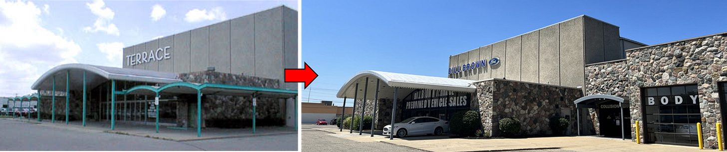 In 2002 Bill Brown Ford, the highest volume Ford dealer in the U.S. for past 4 years, acquired the old movie theater to repurpose it as a collision center.