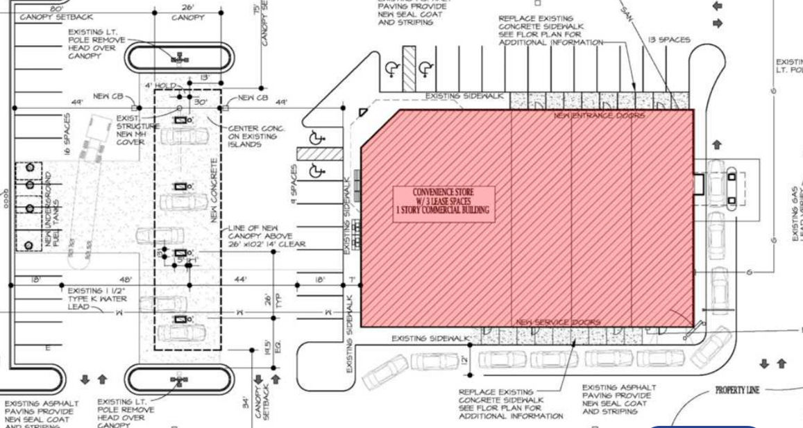 His plan is to include multiple uses within the ~13,000 square foot former drugstore building including a potential pizza restaurant and bank branch as well as a c-store—with gas pumps and electric vehicle chargers in the parking lot.