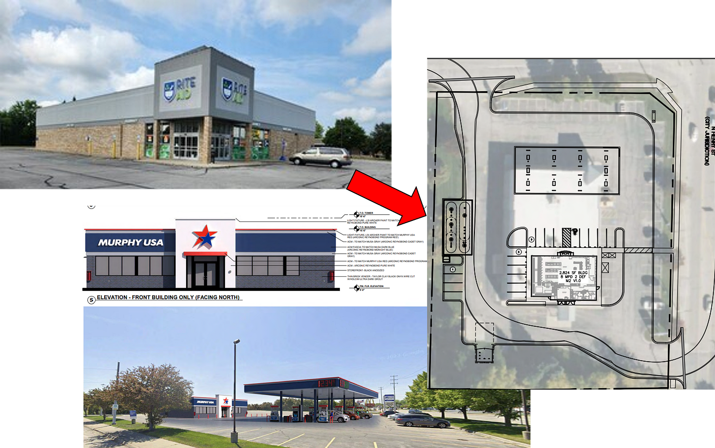 Murphy Oil USA plans to demolish the former Rite Aid, construct a new $3 MM building and install four rows of pump islands for its fueling station.